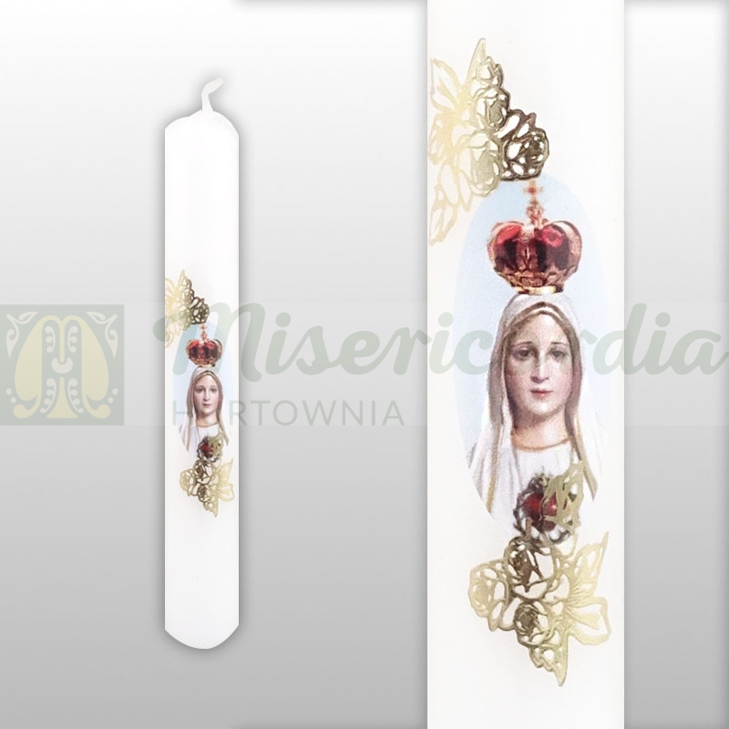 Świeca Gromnica parafinowa z ozdobną naklejką Matki Bożej. Biała