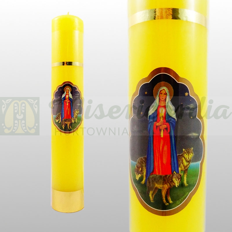 Świeca Gromnica parafinowa z ozdobną naklejką Matki Bożej z Wilkami. Żółta
