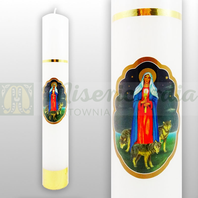 Świeca Gromnica parafinowa z ozdobną naklejką Matki Bożej z Wilkami. Biała