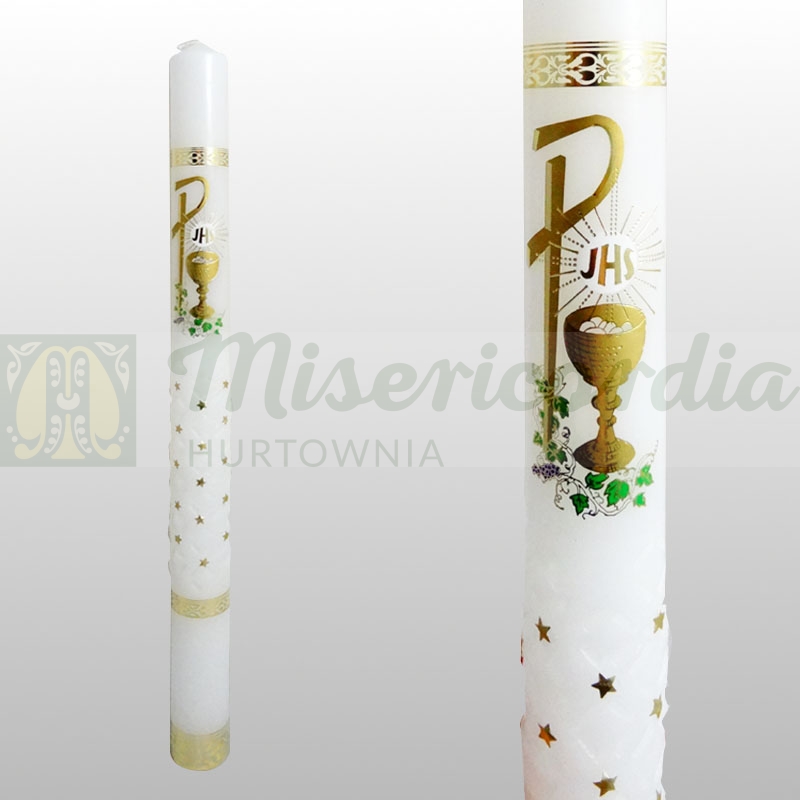 Świeca Komunijna - zdobiona złotymi naklejkami: Kielich, IHS, gwiazdki itd.