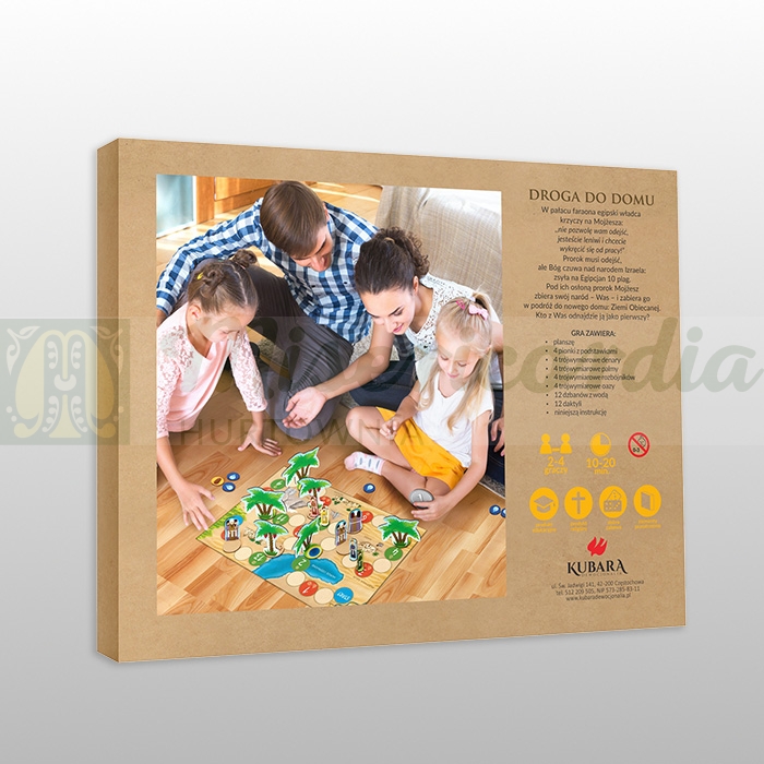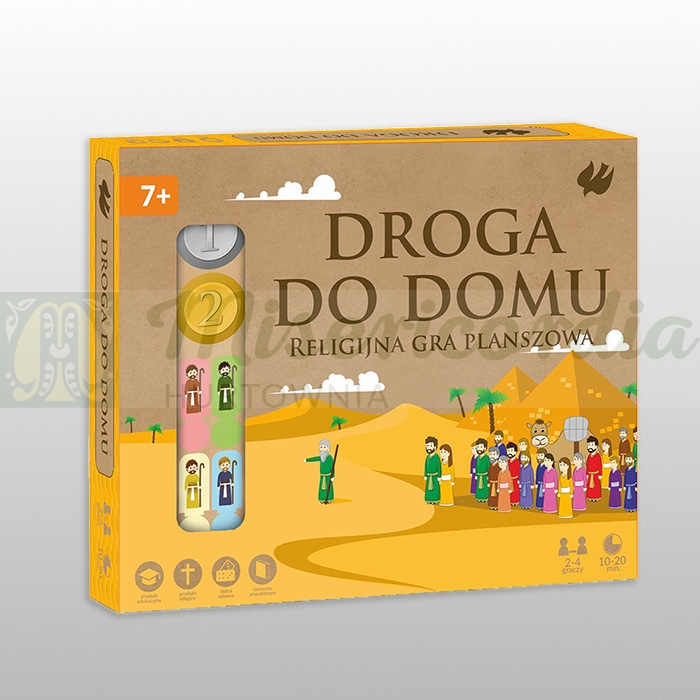 Droga do domu to gra planszowa, w której gracze wcielają się w rolę Izraelitów podróżujących do Ziemi Świętej. Każdy z graczy wybiera pionek i rozpoczyna grę poprzez rzucenie denarem, a następnie przesuwa pionkiem o tyle miejsc ile wskazuje cyfra znajdująca się na denarze (można wyrzucić 1 lub 2). Dodatkowo w pudełku znajduje się: czterech rozbójników, cztery palmy,cztery oazy, dzbany z wodą i daktyle, które należy rozmieścić i użyć dokładnie z wytycznymi znajdującymi się w instrukcji. Na planszy umieszczone są czerwone i zielone pola- na czerwonych polach graczy czekają złe przygody, a na zielonych polach dobre i miłe. Gra kończy się gdy pierwsza osoba dotrze do Kanaan- Ziemi Obiecanej.