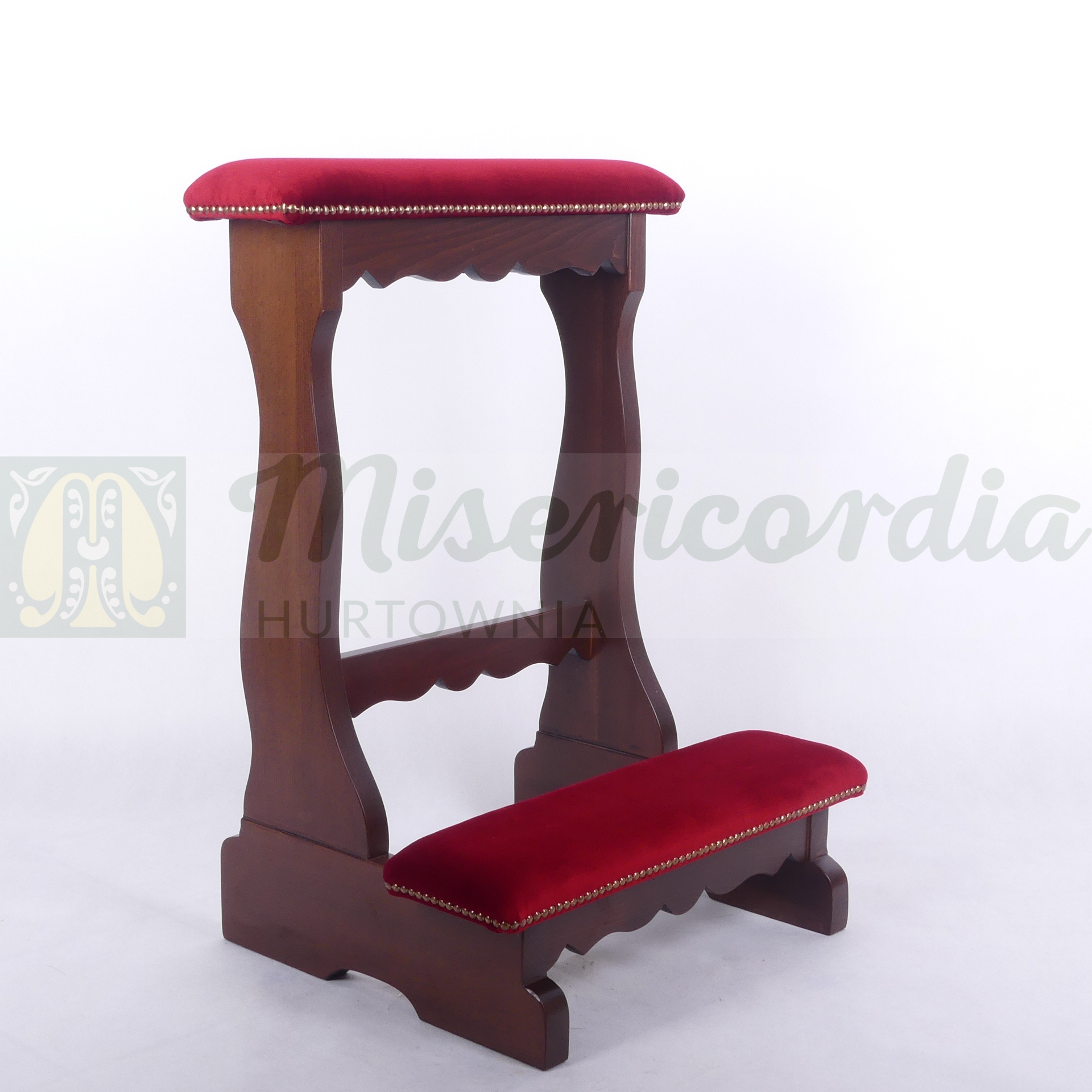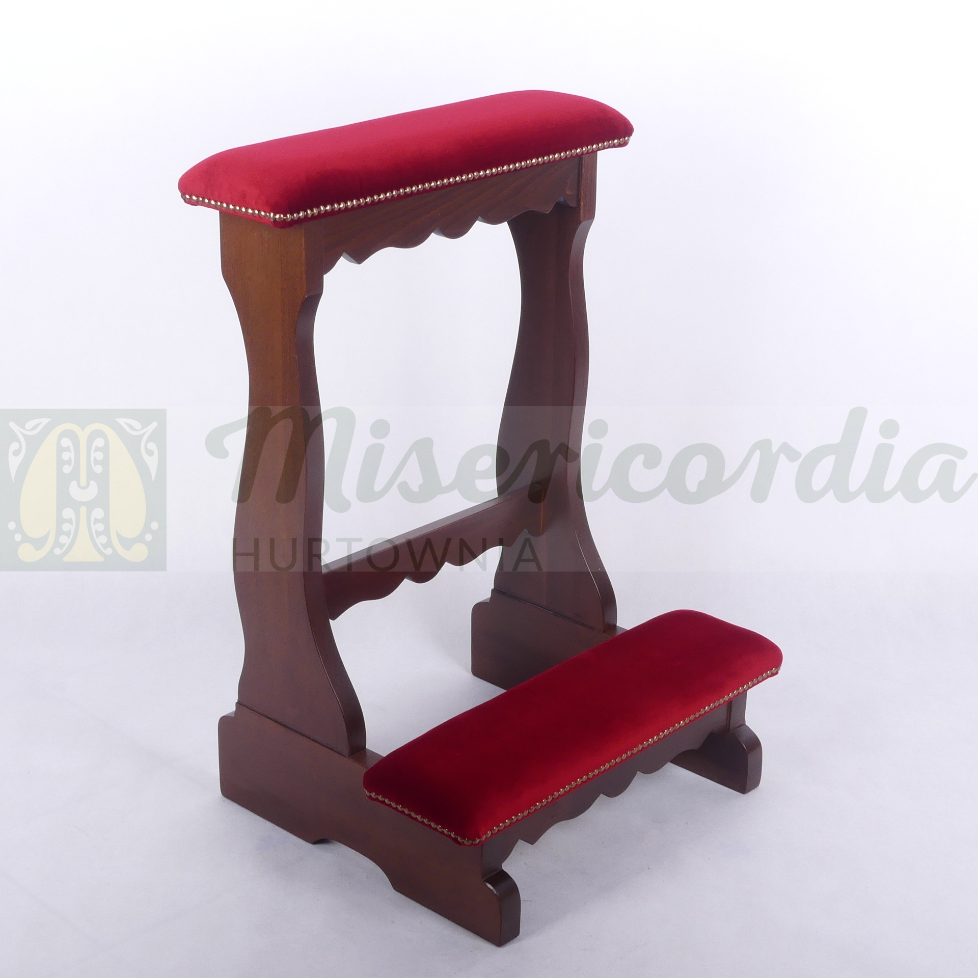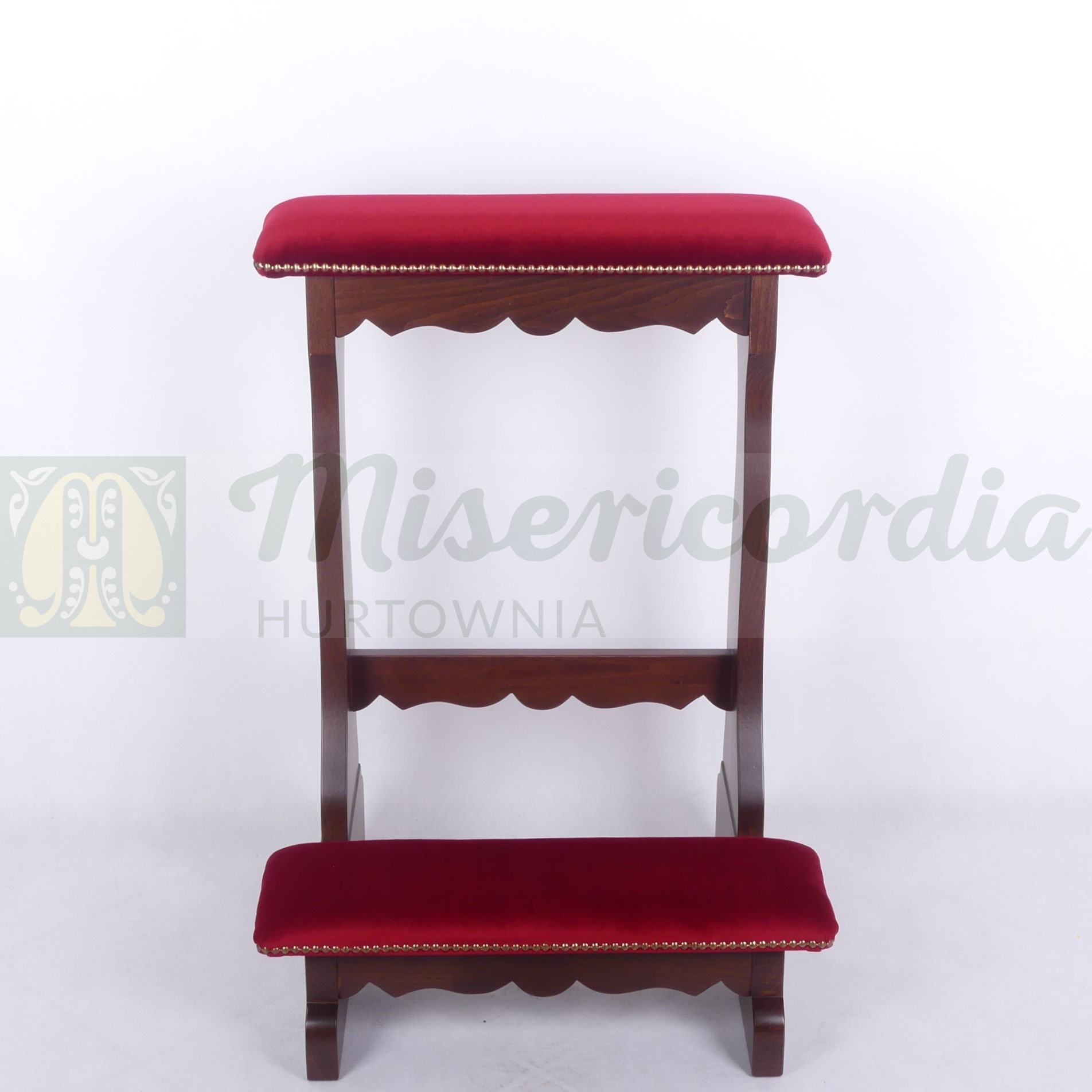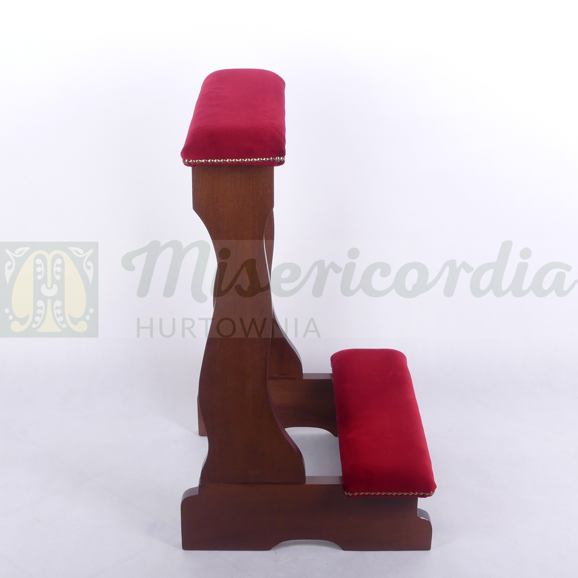 Model został wyposażony w miękkie obicie zarówno w części górnej, jak i dolnej, co wyraźnie podnosi komfort użytkowania podczas modlitwy. Czerwone obicie pięknie kontrastuje z ciemnym drewnem, nadając klęcznikowi wyjątkowo elegancki wygląd. Dodatkowym walorem są ozdobne detale wykończenia.