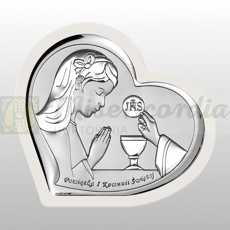 Obrazek Srebrny "Komunia Dziewczynka” w zercu na białym drewnie.