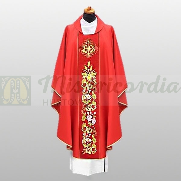 Ornat haftowany bogatym barwnym haftem na pasie. Szata liturgiczna uszyta w stylu gotyckim ze stułą wewnętrzną.