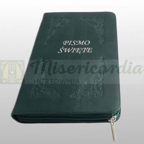 Małe Pismo Święte w skórzanej oprawie zielonej.
