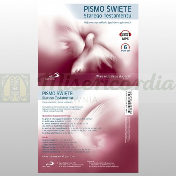 Pismo Święte Starego Testamentu według najnowszego przekładu z języków oryginalnych (tzw. Biblii paulistów), tym razem do słuchania jako audiobook na 6. płytach CD MP3. Poszczególne księgi biblijne poprzedzone zostały komentarzami znanych polskich biblistów. Na opakowaniu tytuł wytłoczony alfabetem Braille’a, co umożliwi osobom niewidzącym szybką identyfikację płyty. Od teraz biblijna historia zbawienia może towarzyszyć Ci wszędzie tam, gdzie jesteś. W domu, w podróży, kiedy pracujesz i kiedy odpoczywasz!
