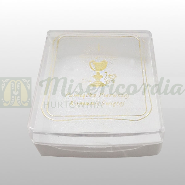 Pudełko pamiątka Pierwszej Komunii. Wymiary: 6 x 7 cm.