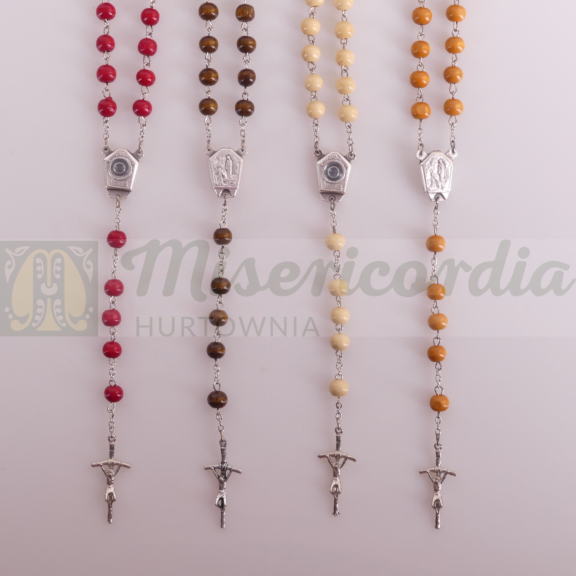 Różaniec kulka drewno, łącznik lourdes woda - mix kolorów